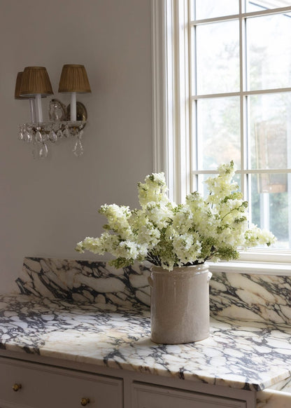The perfect neutral vase for interior design or home decor is this simple but stylish clay flower crock in sand. It features a beige glaze and a glossy finish that catches the eye. Style it with artificial or dried flowers and greens to create a table arrangement that adds a modern look to your space. Color may vary from one vase to the next.